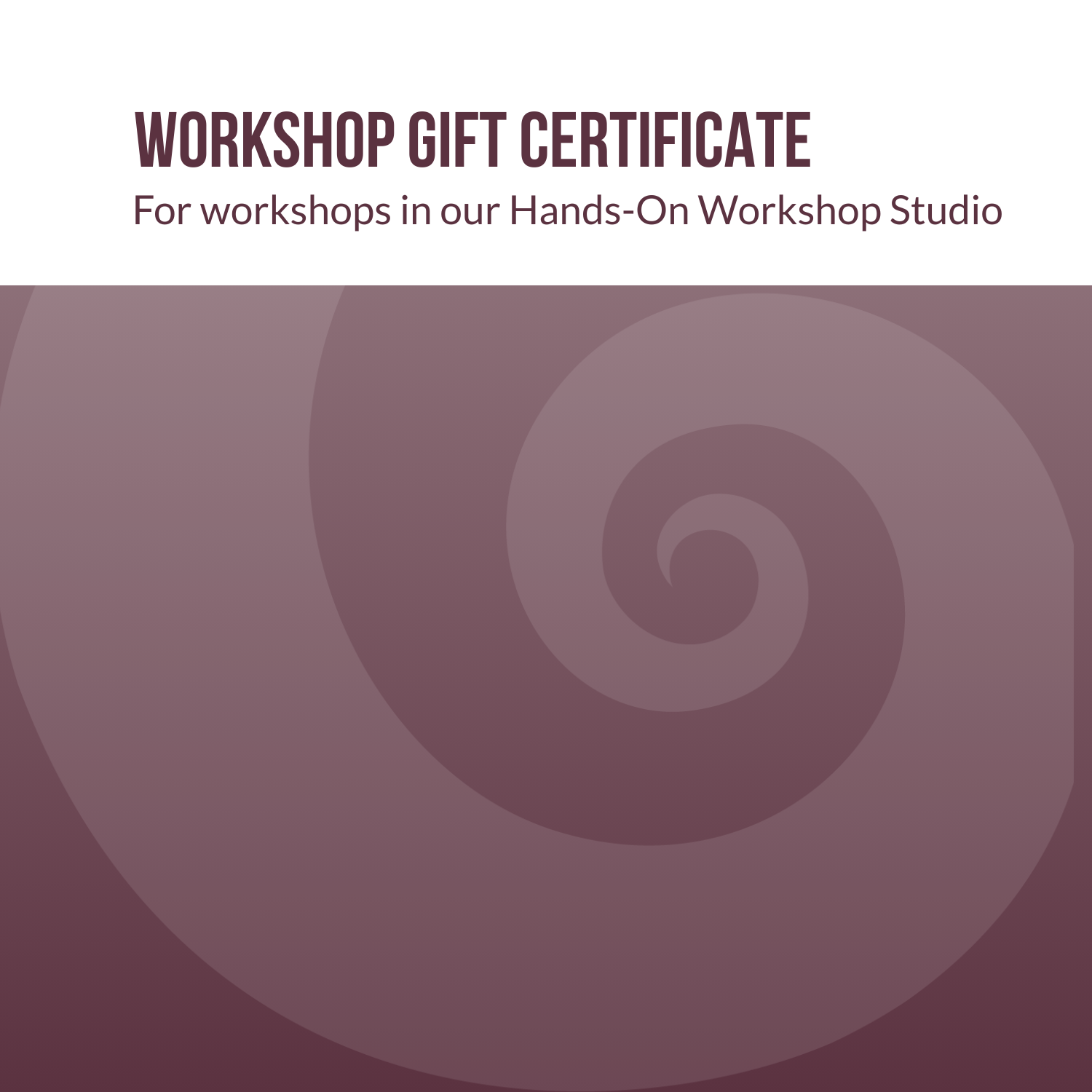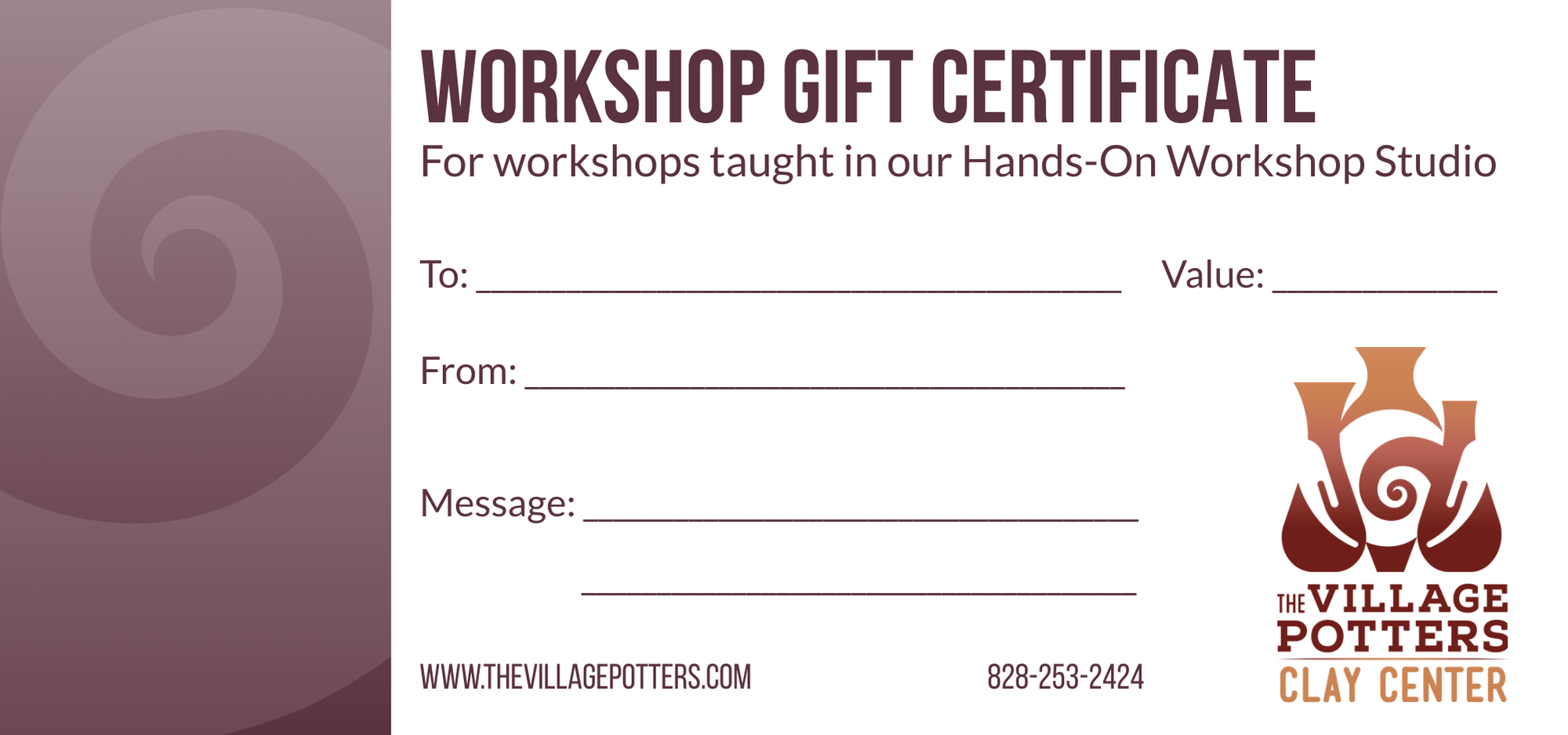 This gift certificate may be redeemed at The Village Potters Clay Center for workshops offered in our Hands-On Workshop (HOW) studio only. It is not valid for weekly classes, studio fees, firings, retail purchases, or pottery supplies. Workshop registration is required and subject to availability. Gift certificates have no cash value and are not redeemable for cash or refunds, and they may not be applied to prior purchases. Gift certificates are intended to be used toward a single workshop registration; any remaining balance may not be refunded.